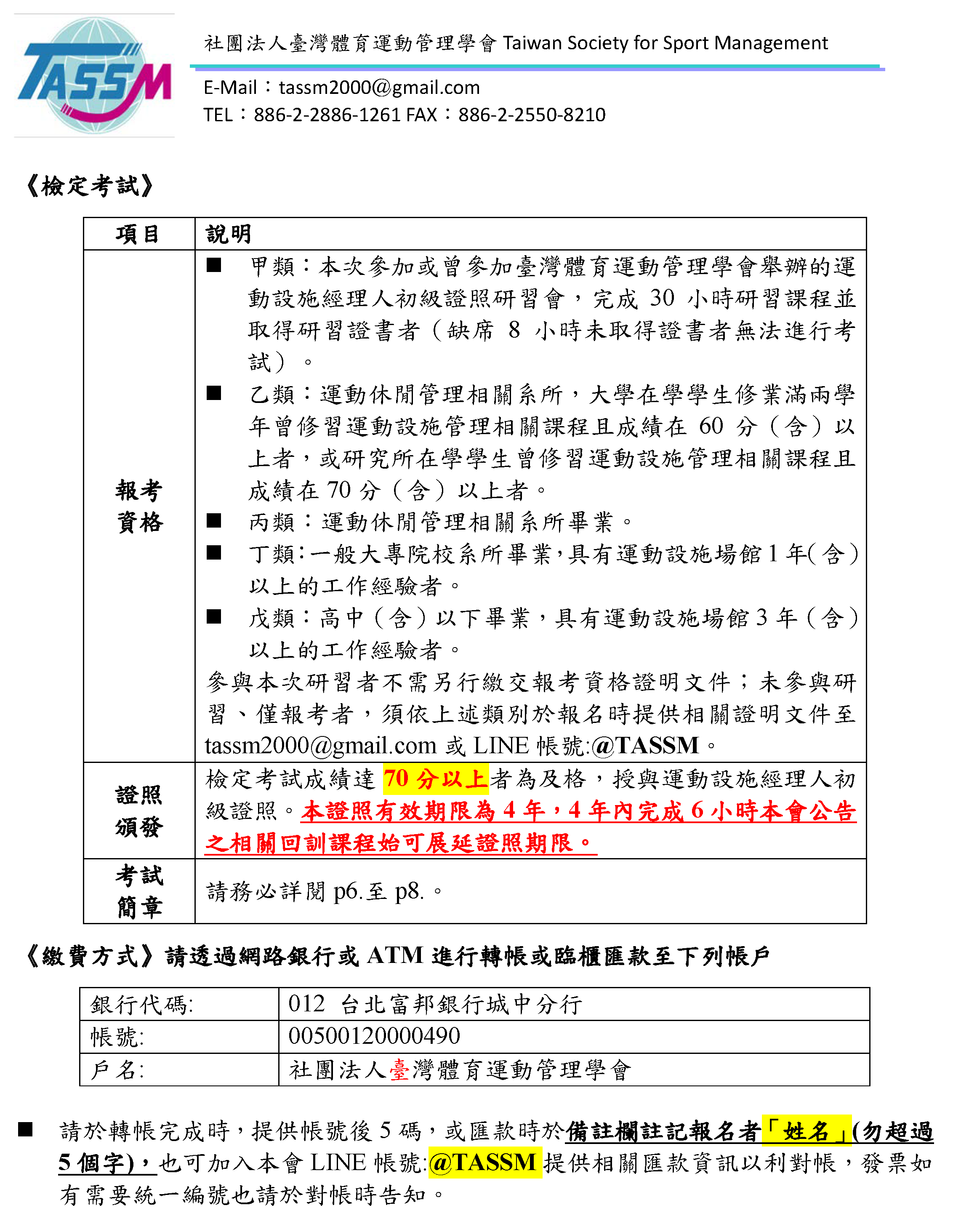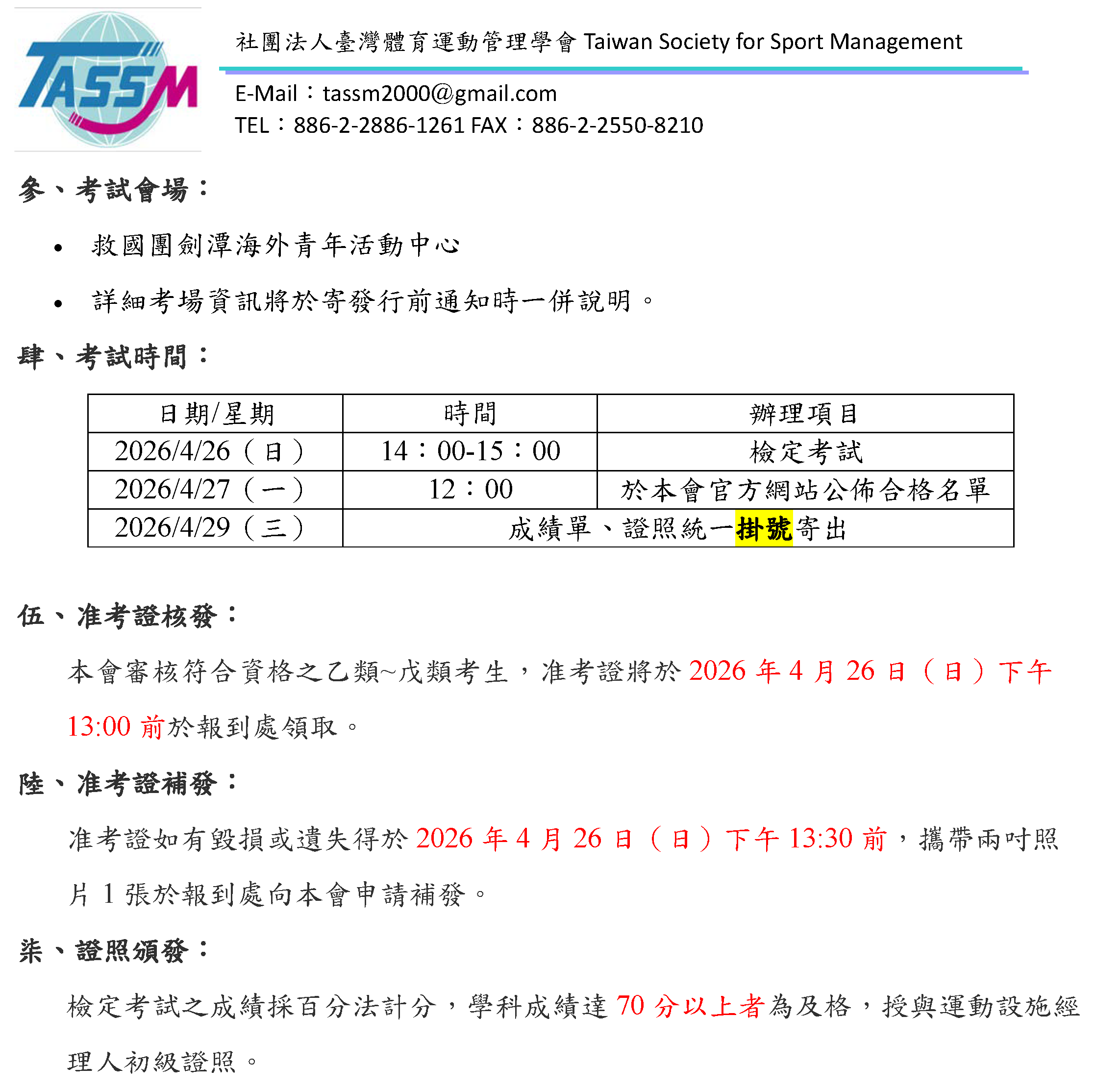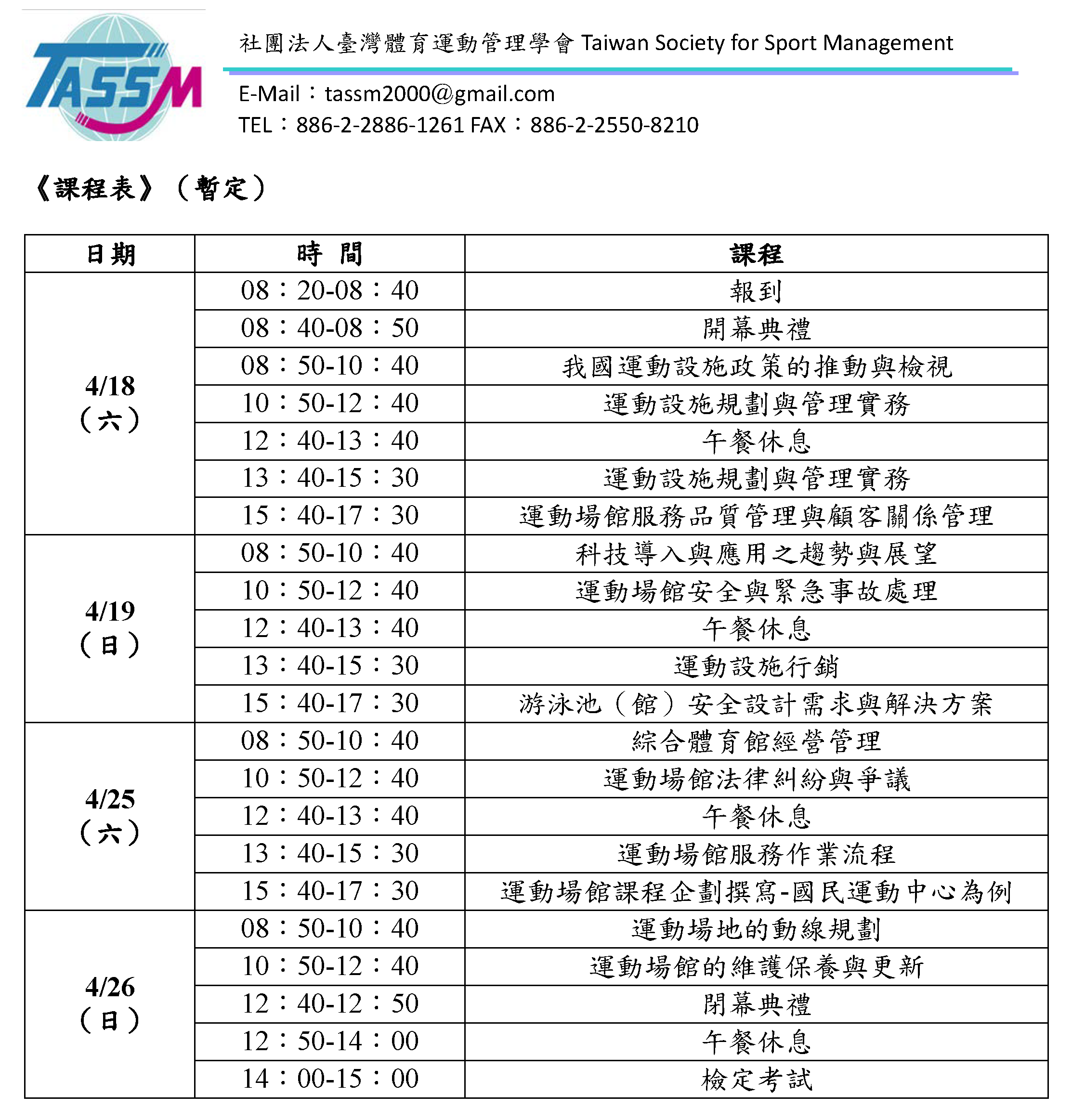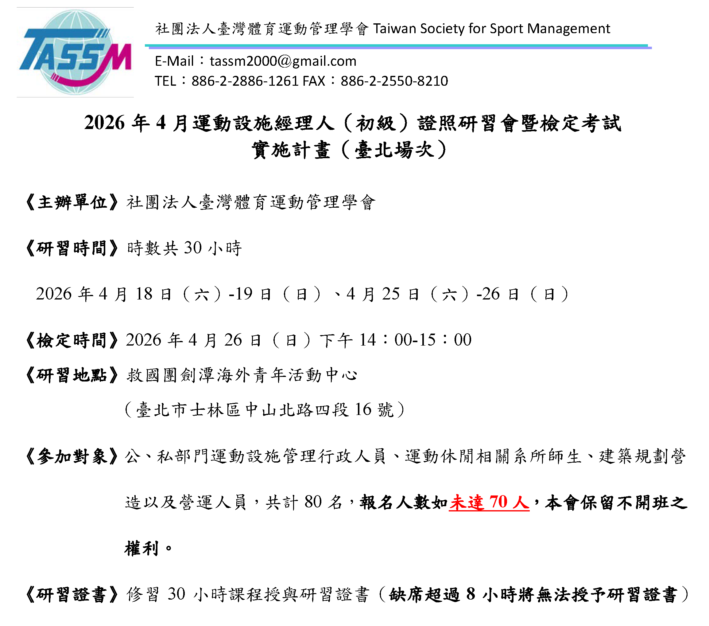 2026年4月運動設施經理人(初級)證照研習會暨檢定考試