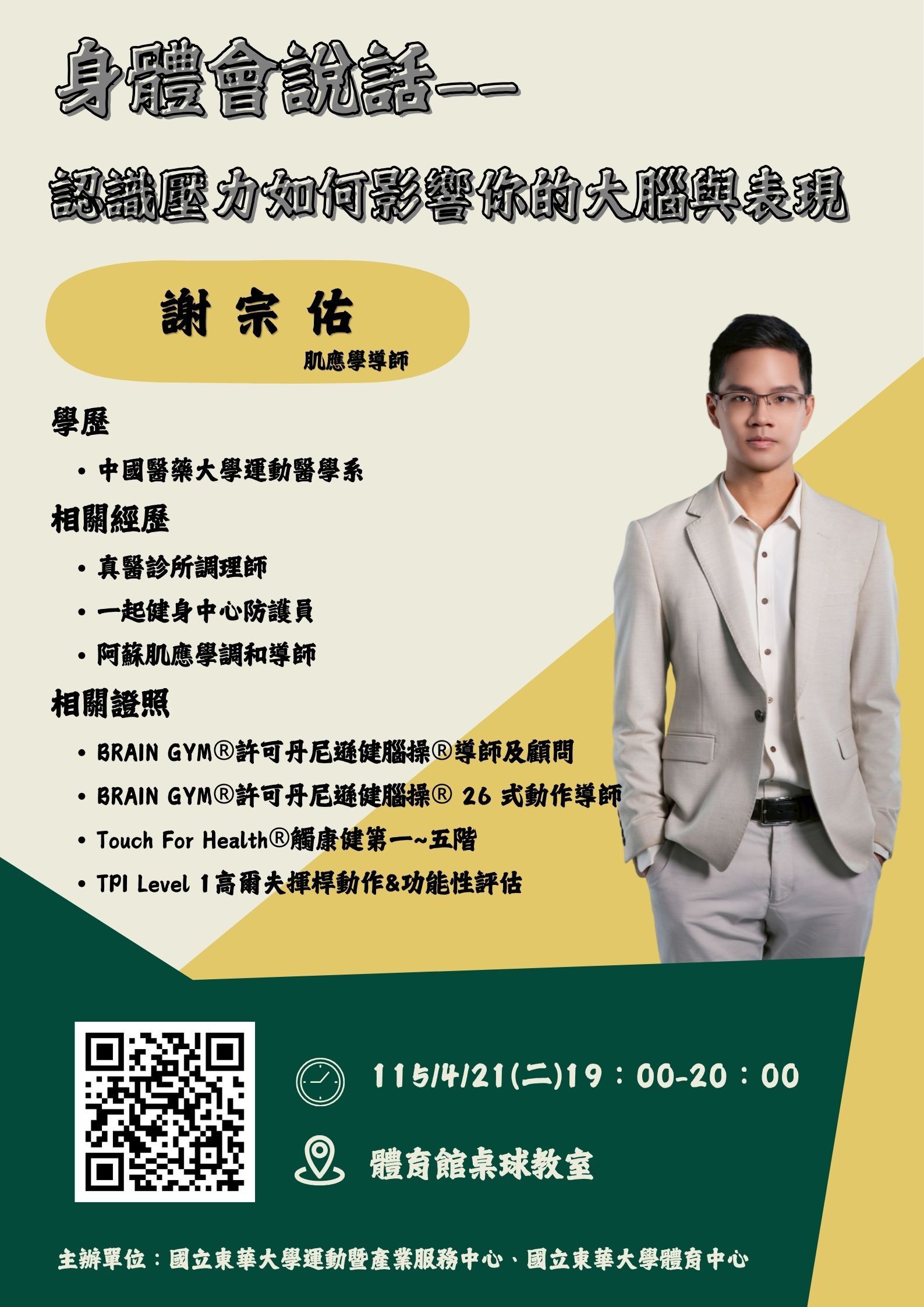 報名網頁:https://sys.ndhu.edu.tw/SA/XSL_ApplyRWD/ActAnnounce.aspx?ActID=29868 【專題演講|身體會說話 🧠💬】 壓力不只是心理感受,更會影響你的大腦運作與表現! 想了解壓力如何影響學習、運動與日常生活嗎? 歡迎參加本次專題演講,一起從身體出發,探索更好的表現方式 💪✨ 📅 時間|115/4/21(二) 19:00–20:00 📍 地點|國立東華大學壽豐校區 體育館桌球教室 🎤 題目|身體會說話——認識壓力如何影響你的大腦與表現 👨🏫 講者|謝宗佑 肌應學導師 【學歷】 中國醫藥大學運動醫學系 【相關經歷】 ▪ 真醫診所調理師 ▪ 一起健身中心防護員 ▪ 阿蘇肌應學調和導師 【相關證照】 ▪ BRAIN GYM®許可丹尼遜健腦操®導師及顧問 ▪ BRAIN GYM®許可丹尼遜健腦操®26式動作導師 ▪ Touch For Health®觸康健第一~五階 ▪ TPI Level 1高爾夫揮桿動作 & 功能性評估 🏫 主辦單位|國立東華大學運動暨產業服務中心、國立東華大學體育中心 歡迎對壓力管理、運動表現與身心整合有興趣的師生踴躍參加!🙌 報名網頁:https://sys.ndhu.edu.tw/SA/XSL_ApplyRWD/ActAnnounce.aspx?ActID=29868